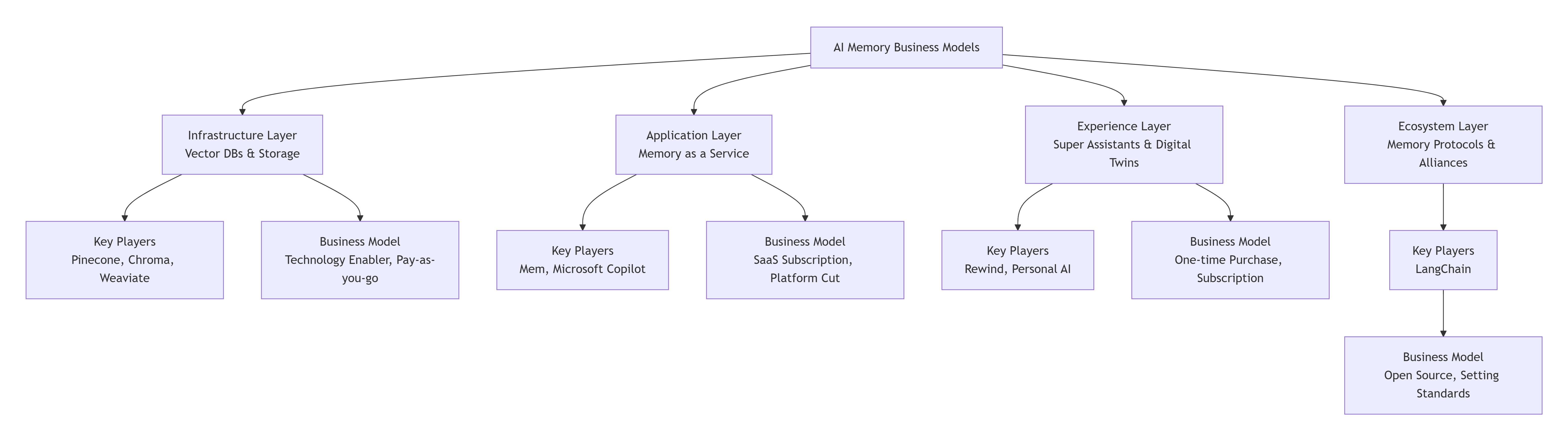 Business models around "AI Memory" are rapidly emerging and crystallizing into distinct layers. The following chart outlines the core business models and key players in this ecosystem: